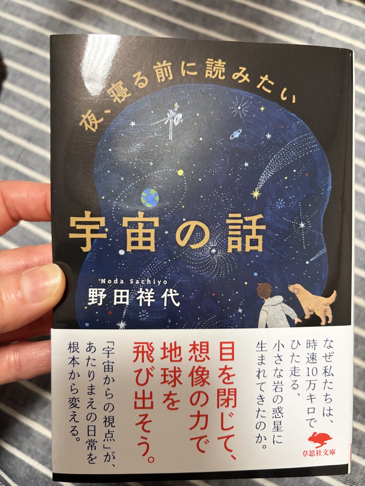 「夜、寝る前に読みたい宇宙の話」という本なのですが、壮大な宇宙の話を読んで宇宙目線で見ると私達の存在は点にもならないくらいの微々たるものなんだなぁと気づかされます^_^
